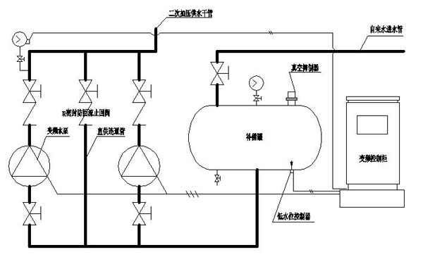 自來水管網的水進入穩流流罐,罐內空氣從真空消除器排出,待水充滿后,真空消除器自動關閉。當自來水管網壓力能夠滿足用水要求時,系統由旁通止回閥向用水管網直接供水;當自來水管網壓力不能滿足用水要求時,系統壓力信號由遠傳壓力表反饋給變頻控制器,水泵運行,并根據用水量的大小自動調節轉速恒壓供水,若運轉水泵達到工頻轉速時,則啟動另一臺水泵變頻運轉。水泵供水時,若自來水管網的水量大于水泵流量,系統保持正常供水:用水高峰時,若自來水管網水量小于小泵流量量,穩流罐內的水作為補充水源仍然能正常供水,此時,空氣由真空消除器進入穩流罐,罐內真空遭到破壞,確保了自來水管網不產生負壓,用水高峰過后,系統又恢復到正常供水狀態。當自來水管網停水,造成穩流罐液位不斷下降,液位探測器將信號反饋給變頻控制器,水泵自動停機,以保護水泵機組。夜間小流量供水且自來水管網壓力不能滿足要求時,氣壓罐可以貯存并釋放能量,避免了水泵頻繁啟動優點:1、無污染:沒有池子和盛水的箱子,從來水全嚴密封閉形式運行,完全沒有二次污染。